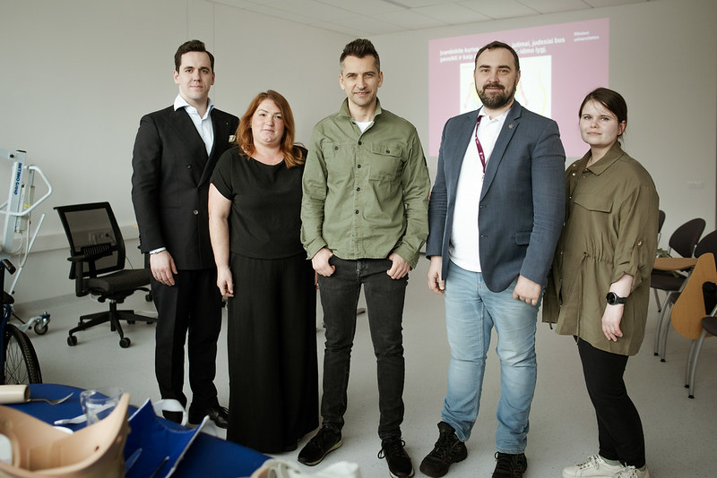 Iš kairės: Medicinos fakulteto ergoterapijos specialistai Justinas Blaževičius, doc. Aušra Adomavičienė, Alanas Chošnau, Reabilitacijos, fizinės ir sporto medicinos katedros vadovas dr. Tomas Aukštikalnis, Mantvilė Grybauskaitė. Indrės Mažeikienės nuotr.