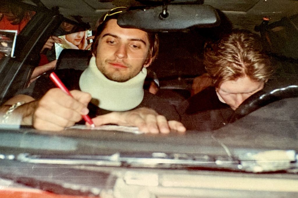 Alanas Chošnau dalina autografus po pasirodymo, kuriame koncertavo su kaklo įtvaru, 1998 m. Asmeninio archyvo nuotr.