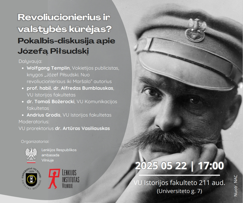 Gegužės 22 d. 17 val. Vilniaus universitetas (VU) kviečia į viešą diskusiją „Revoliucionierius ir valstybės kūrėjas? Pokalbis-diskusija apie Józefą Piłsudskį“, skirtą vokiečių publicisto Wolfgango Templino naujai knygai apie vieną ryškiausių ir prieštaringiausiai vertinamų XX a. Vidurio Europos politinių figūrų.